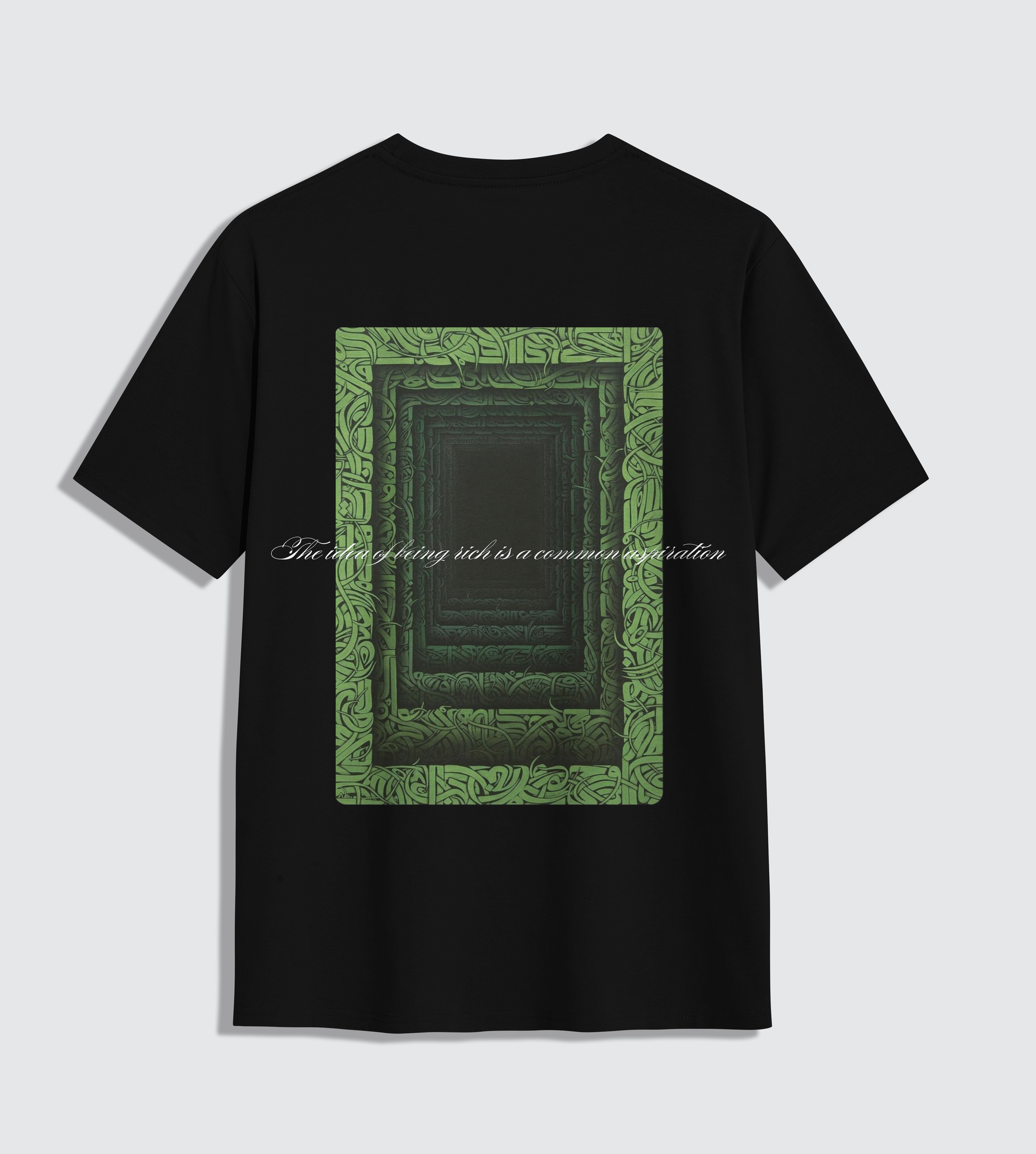 A quiet message with sharp impact. The YOUTH tee plays with layered typography and depth, calling out a simple truth: "The idea of being rich is a common aspiration, particularly among youth." The design mirrors that mindset—structured, infinite, and questioning.